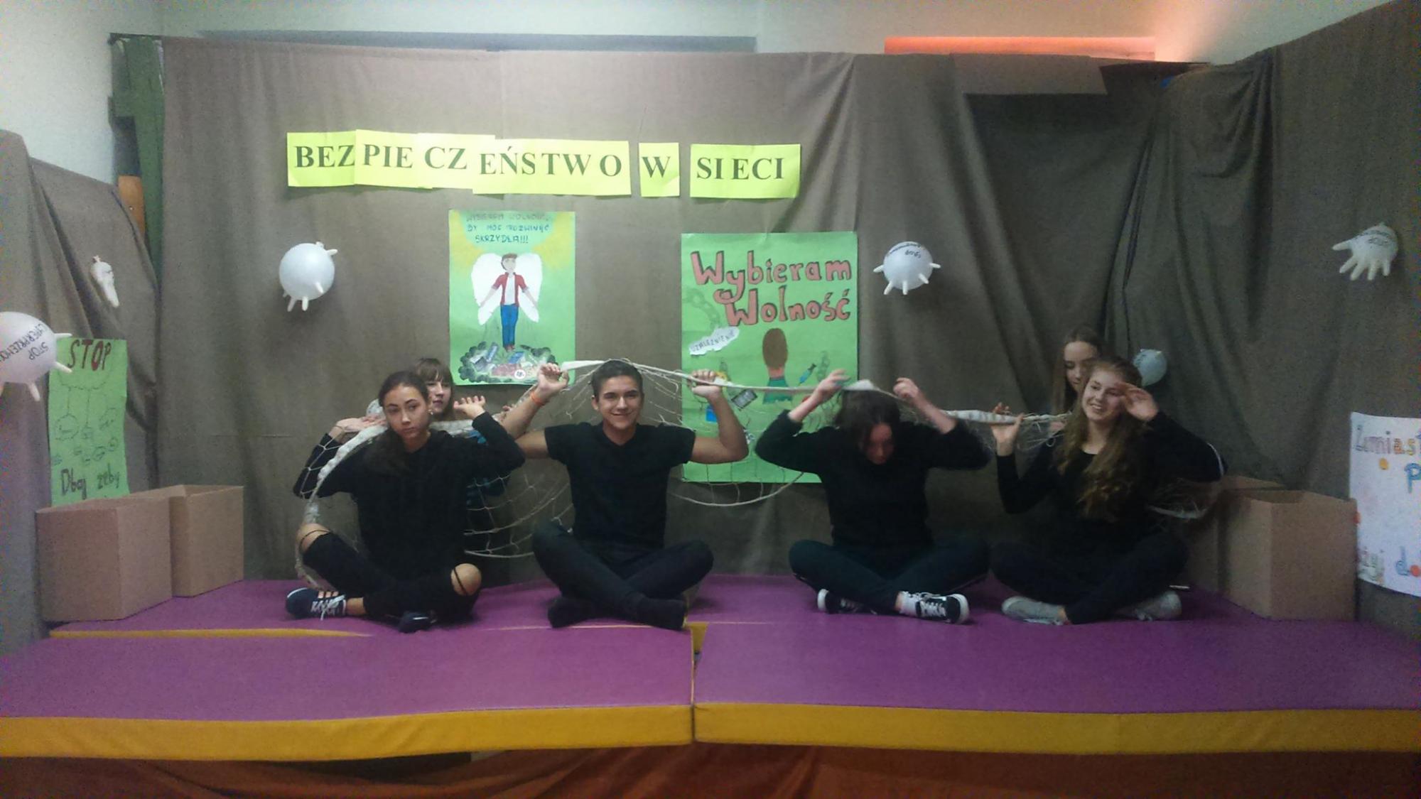 5. spektakl teatralny „Wybieram wolność” dotyczący cyberprzemocy i uzależnień od internetu zaprezentowany przez uczniów gimnazjum.
