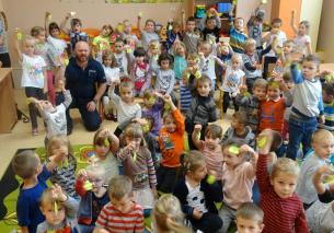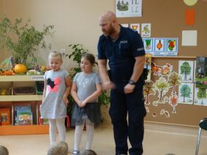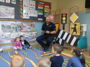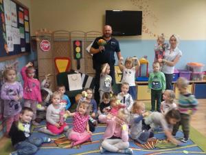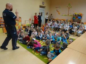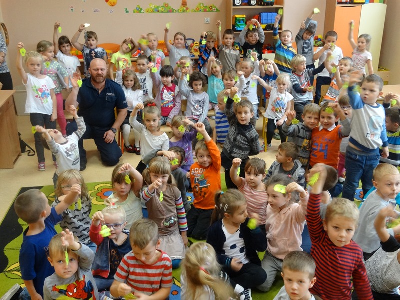 Pokazał przedszkolakom broń oraz inne akcesoria policyjne. W ten deszczowy dzień dzieci mogły przez okno zobaczyć radiowóz, którym nasz gość przyjechał. Dowiedziały się także o innych pojazdach używanych w policji takich jak helikoptery czy motorówki. Pomocne w policji są także psy, które służą do wykrywania materiałów wybuchowych oraz specjalnie szkolone do tropienia przestępców. Pogadanka w grupach: III, IV i V na temat zapewnienia dzieciom bezpieczeństwa na drogach, w środkach transportu i w mieszkaniach trwała około godziny. Pan policjant zapraszał dzieci, aby pokazały w jaki sposób przechodzą przez ulicę. Przestrzegał przed otwieraniem drzwi osobom nieznajomym. Dwie najmłodsze grupy przedszkolne powitały gościa piosenką zatytułowaną „Dzieci i światła.” Bardzo się ucieszyły z odblaskowych koniczynek, które otrzymały z rąk pana Macieja. W ramach akcji Cała Polska czyta dzieciom pan policjant przeczytał książeczkę Juliusza Wasilewskiego pt. „Jak Paw przez jezdnię przechodził” i zadał dzieciom kilka pytań dotyczących utworu. Na zakończenie w imieniu dyrekcji, nauczycieli, pracowników przedszkola i wszystkich przedszkolaków złożyliśmy gorące podziękowanie panu Maciejowi Matusiakowi i życzymy dalszych sukcesów w pracy.