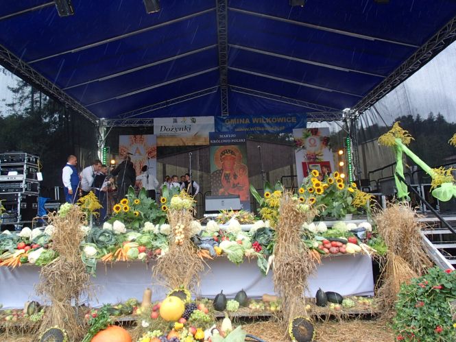 Co prawda, obfity deszcz zmienił trochę planowany przez organizatorów scenariusz, jednakże najważniejszy punkt; Msza Święta odbyła się przy pięknie udekorowanym ołtarzu polowym. Mszy św. dożynkowej sprawowanej przez księży z całej diecezji przewodniczył Jego Ekscelencja Biskup Diecezji Bielsko-Żywieckiej ks. Roman Pindel. Z naszego wilamowickiego dekanatu obecny był proboszcz Sanktuarium Świętego abp Józefa Bilczewskiego z Wilamowic Stanisław Morawa. Podczas mszy świętej wystawione były poczty sztandarowe.