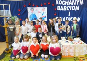 Grupa IV- 4-5 latki z okazji Dnia Babci i Dziadka przygotowały humorystyczną inscenizację. W jej trakcie dzieci śpiewały również piosenki połączone z ruchem tanecznym i wykonały akompaniament na instrumentach perkusyjnych.