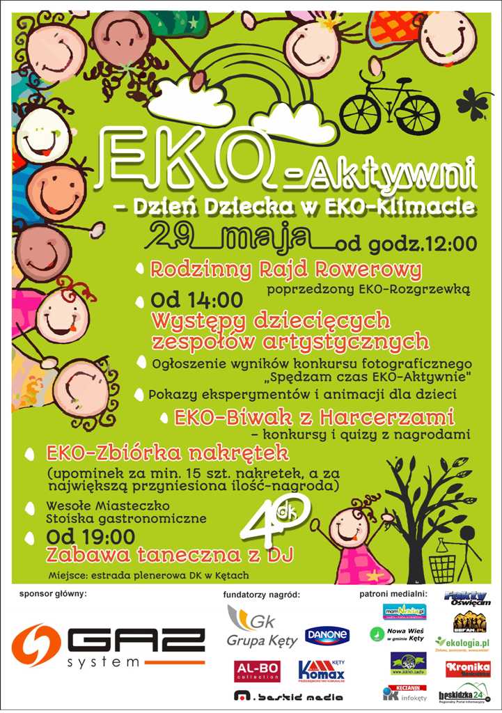 Zapraszamy na rodzinne obchody Dnia Dziecka z Domem Kultury w Kętach. "Eko-aktywni. Dzień Dziecka w Eko-klimacie" odbędzie się 29 maja. O godz. 12.00 rozpocznie się Rodzinny Rajd Rowerowy, a o 14.00 plenerowa impreza na placu przed Domem Kultury. |