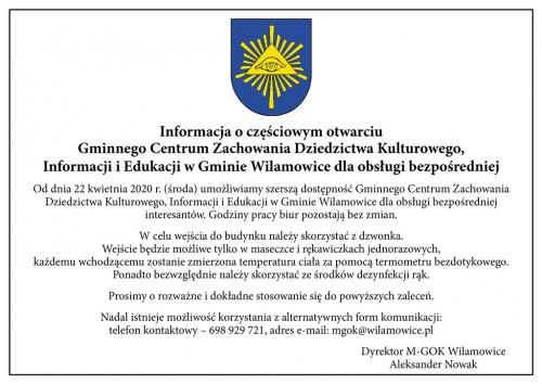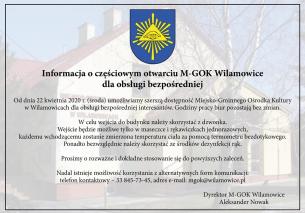 Informacja o częściowym otwarciu M-GOK Wilamowice dla obsługi bezpośredniej