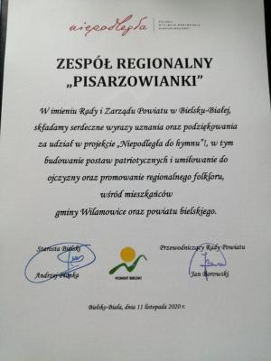 Na „Pisarzowianki” czekała bardzo miła niespodzianka, podziękowanie Starosty Bielskiego Andrzeja Płonki oraz Przewodniczącego Rady Powiatu Jana Borowskiego, za udział w projekcie, budowanie postaw patriotycznych, umiłowanie do ojczyzny oraz promowanie regionalnego folkloru w gminie Wilamowice i powiecie bielskim.