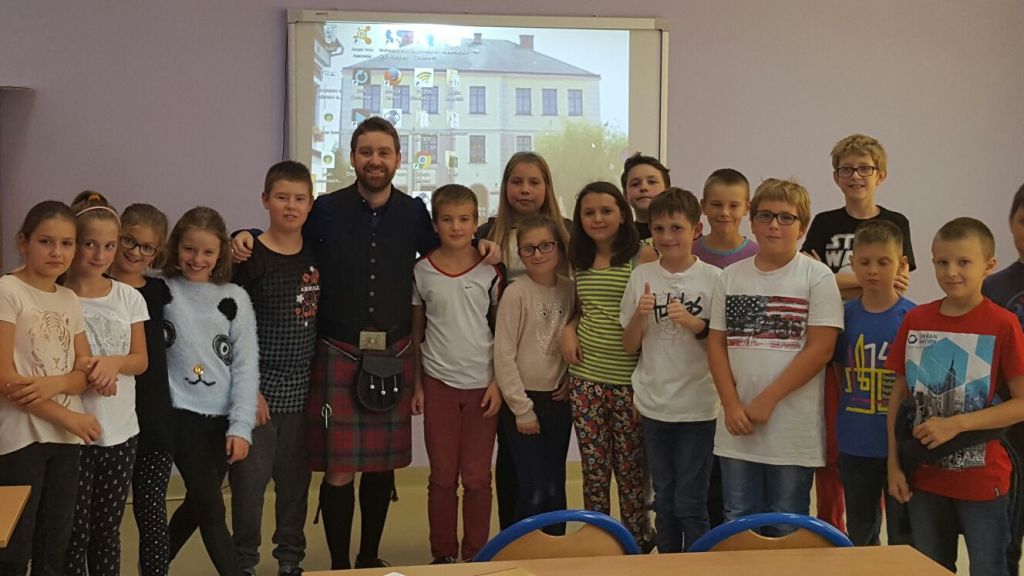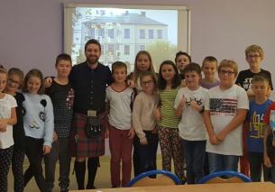 Z kolei 22 września mieliśmy przyjemność gościć w naszej szkole rodowitego Szkota, Douglasa McNaught, który przybył do Wilamowic w ramach projektu „Humanistyka Zaangażowana w Europie”, a swoją wizytą przyczynił się do urozmaicenia lekcji języka angielskiego w klasie 5a. Uczniowie z zainteresowaniem uczestniczyli w tych wyjątkowych zajęciach, które jednocześnie uświadomiły wszystkim jak ważny i niezastąpiony w nauce języków obcych jest kontakt z żywym językiem. Douglas w ciekawy sposób przybliżył historię, geografię i kulturę Szkocji. Opowiedział o tradycyjnym szkockim stroju, w którym przybył, pokazał wiele zdjęć i filmiki związane ze szkockimi tradycjami. Ponadto, poprowadził z naszymi uczniami krótkie warsztaty taneczne. To był dzień pełen wrażeń i na pewno na długo pozostanie w pamięci.