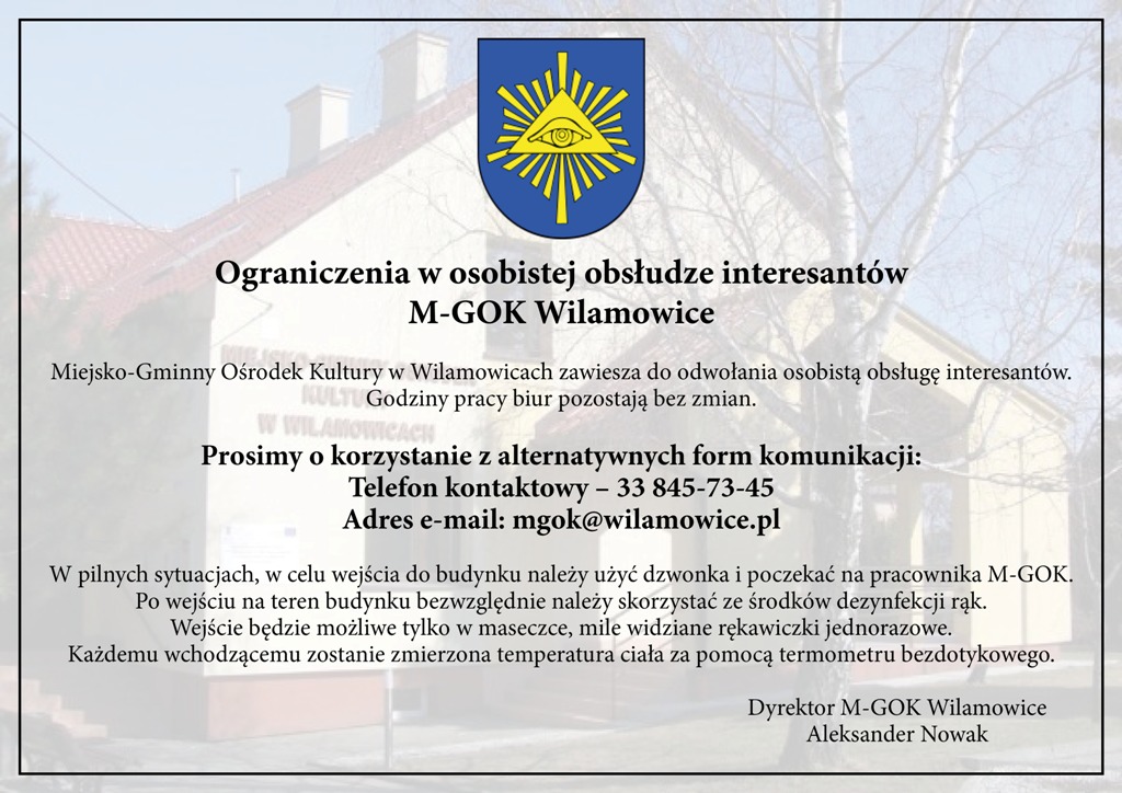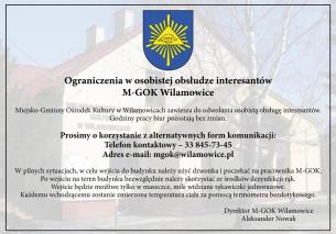 Ograniczenia w osobistej obsłudze interesantów M-GOK Wilamowice wt., 2020-07-21 11:24 | Anna Klimczak