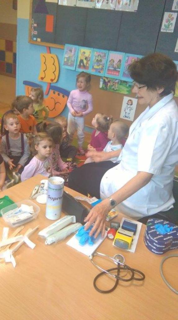 Lekarza pediatrę dzieci znają z wizyt w przychodni. Zwykle odbywają się one przy okazji choroby lub szczepień, co nie kojarzy się dzieciom zbyt przyjemnie. Tym razem sytuacja była odwrotna. Lekarz odwiedził dzieci w przedszkolu. Przy okazji omawiania tematyki kompleksowej dotyczącej zdrowia zaprosiliśmy panią doktor Jolantę Kabashi. Dzieci przywitały ją bardzo serdecznie, wielu znało ją z wizyt w ośrodku zdrowia. Lekarka zaprezentowała dzieciom narzędzia, które na co dzień wykorzystuje w pracy, każdy mógł posłuchać bicia swego serca, zajrzeć do ucha kolegi, zobaczyć jak należy wykonać opatrunek na wypadek skaleczenia. Na podstawie wiersza ,,Chory kotek” pani doktor wyjaśniała dzieciom jak należy się zachować, aby uniknąć zachorowań. Na zakończenie każdy przedszkolak otrzymał dyplom i naklejkę ,,wzorowego pacjenta” oraz słodki upominek w postaci witaminowych żelków. Składamy serdeczne podziękowania pani doktor za przybycie i ciekawe zajęcia.