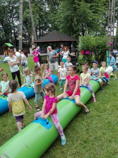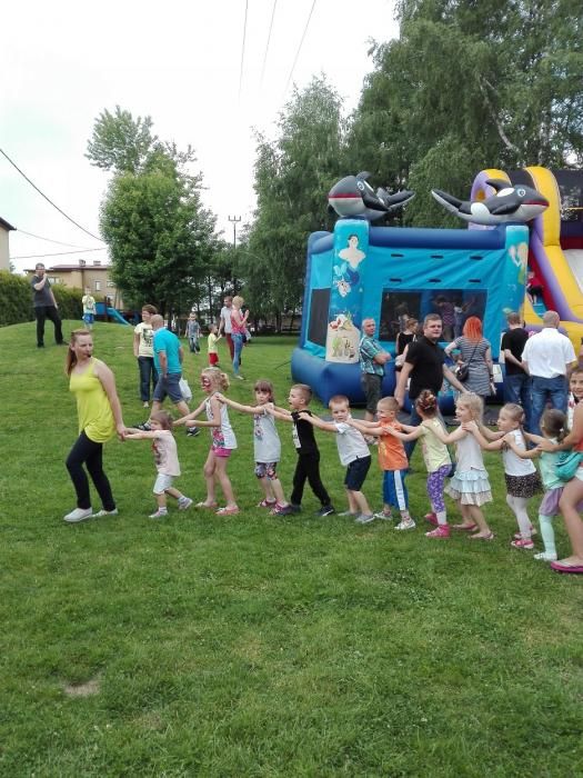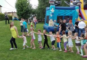 Na dzieci czekało wiele atrakcji, m.in. dmuchane zamki, tańce i konkursy pod okiem wodzireja Sławka, warsztaty plastyczne, malowanie buziek.