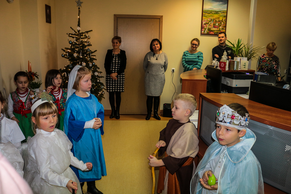 W repertuarze muzycznym znalazły się utwory takie jak: Piosenka pani Zimy, Taniec góralski, Malusieńki Jezus, Dziś w Betlejem, Ciemno, cicho , jak również kolęda Lulajże Jezuniu. Oprócz życzeń skierowanych do panów Burmistrzów oraz pracowników Urzędu Gminy wręczyliśmy świąteczne upominki, które przygotowały dzieci wspólnie z rodzicami w czasie warsztatów plastycznych. Nasz trud włożony w przedstawienie został doceniony przez Sekretarza Gminy pana Andrzeja Kołtuna, który gorąco podziękował za bogatą i wymowną treść życzeń.