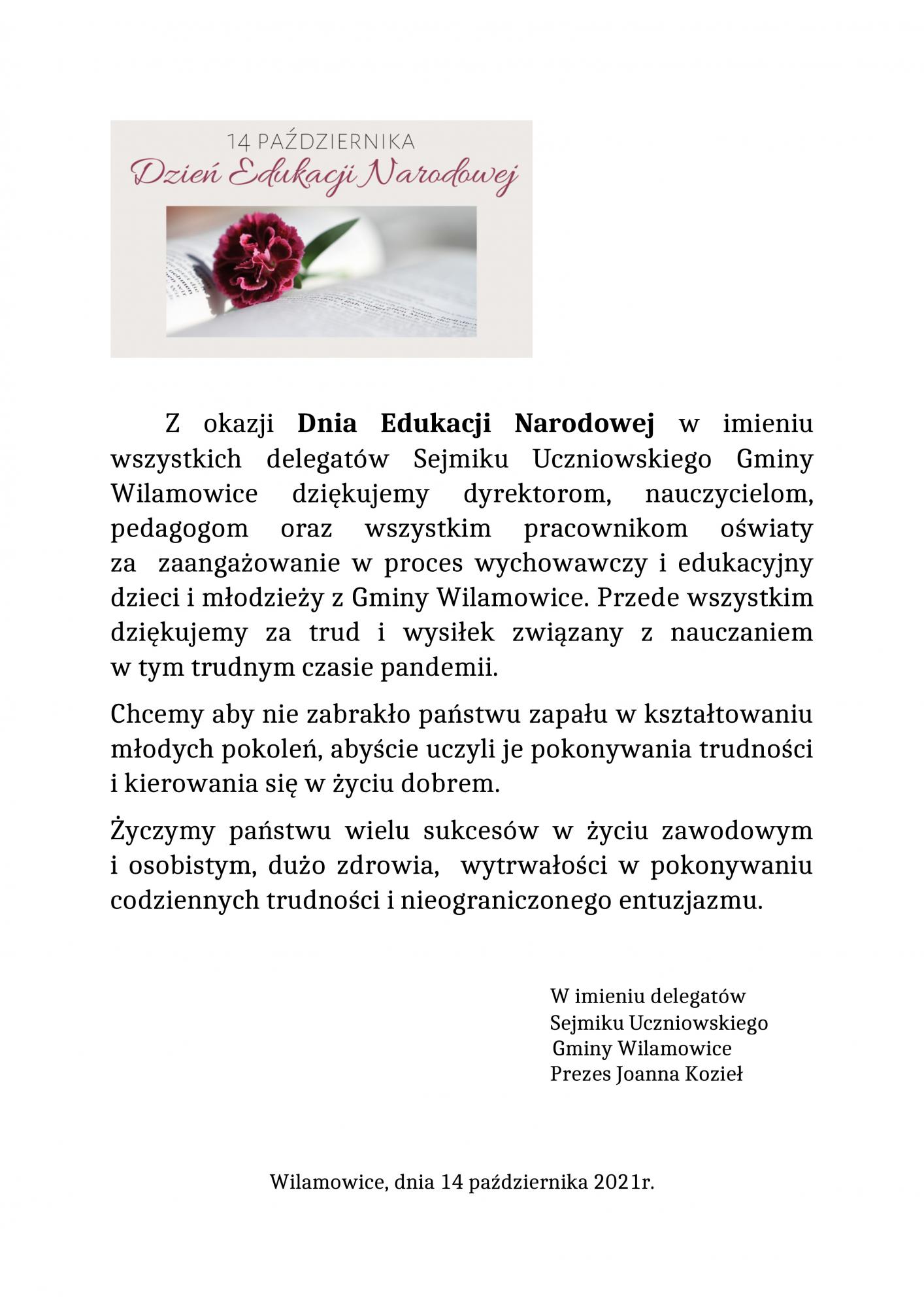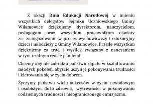 Podziękowania od delegatów Sejmiku Uczniowskiego Gminy Wilamowice z okazji Dnia Edukacji Narodowej pon., 2021-10-25 12:16 | Anna Klimczak