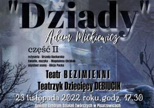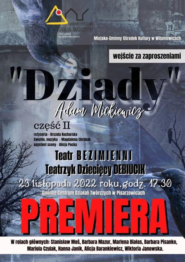 Już 23 listopada o godz. 17.30 w Gminnym Centrum Działań Twórczych w Pisarzowicach odbędzie się premiera II części "Dziadów" Adama Mickiewicza. Na scenie wystąpią aktorzy z Teatru BEZIMIENNI i Teatrzyku Dziecięcego DEBIUCIK. Serdecznie zapraszamy!