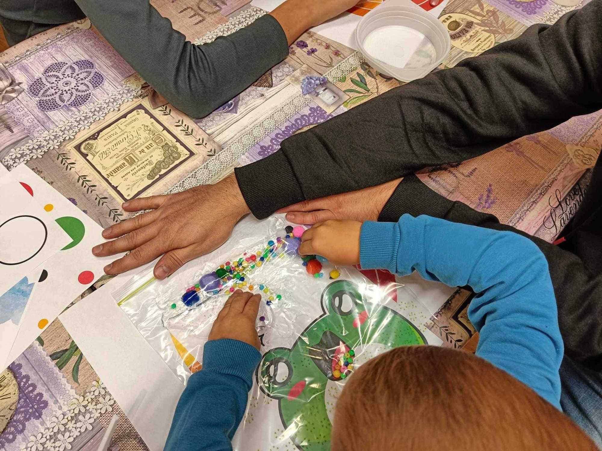 Wykorzystując zabawy sensoryczne maluchy wraz z rodzicami poznawały świat barw i odcieni. Przygotowaliśmy eko bransoletki dla par uczestników, a na koniec każde dziecko miało okazję samodzielnie stworzyć obraz malowany paluszkami.