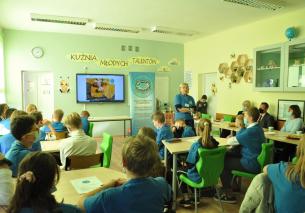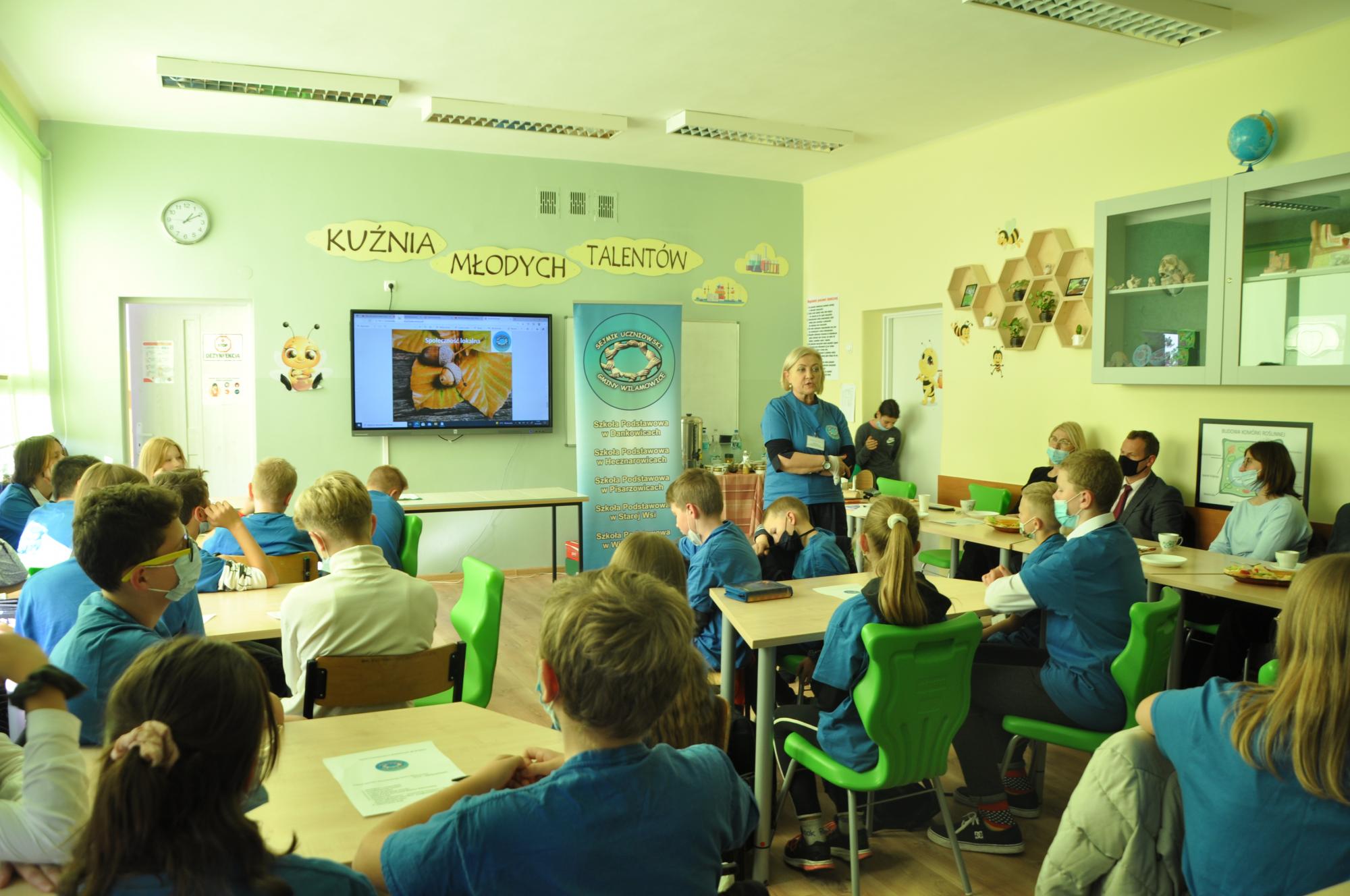 W nawiązaniu do społeczności szkolnej jaką tworzymy, niedawno obchodziliśmy pięćdziesięciolecie istnienia budynku naszej szkoły. Równocześnie świętowaliśmy otwarcie tak zwanej "Zielonej pracowni", z której jesteśmy bardzo dumni. Dlatego w drugiej części spotkania odbył się niezwykły pokaz przygotowany przez Panią Marzenę Nycz, której starania zostały docenione w konkursie o adaptację pracowni chemiczno-przyrodniczej. Pani Marzena wraz z uczennicami klasy 7b przygotowała bardzo efektowne doświadczenia chemiczne. Tą wisienką na torcie zakończyliśmy spotkanie w "Kuźni Młodych Talentów"-sali, w której codziennie uczniowie mogą czuć się jak w sadzie pachnącym kwiatami.