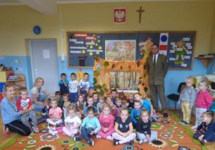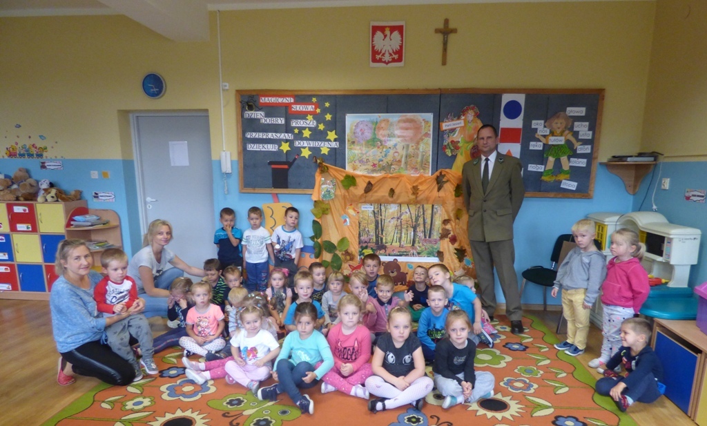 W piątkowe deszczowe przedpołudnie 5. października 2017 roku nasze przedszkole gościło w swych progach pana leśniczego reprezentującego Nadleśnictwo Andrychów.