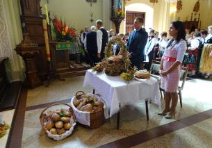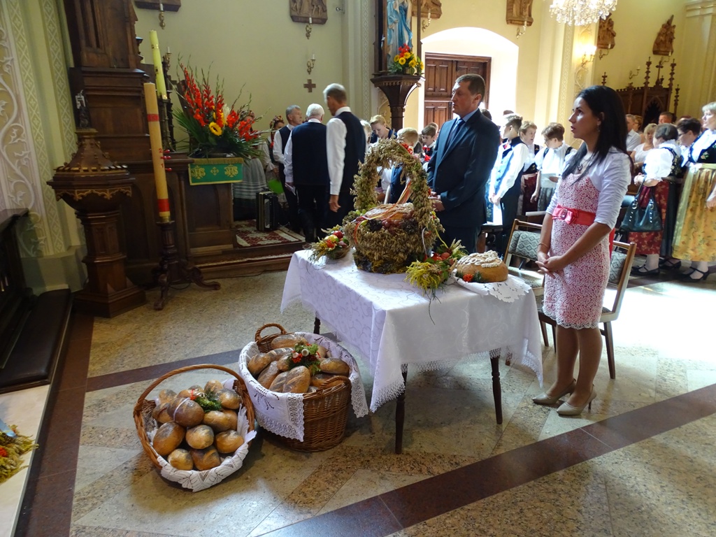 W uroczystej oprawie, wspólnie z zespołami „Dankowianie” i zespołem wokalno-tanecznym tutejszej szkoły, modliliśmy się za rolników i ich rodziny. Mszę św. odprawił i homilię wygłosił ksiądz proboszcz Józef Jakubiec. Delegacja ze Stowarzyszenia Kaniówka wspólnie z nami uczestniczyła we mszy świętej i swój wieniec ofiarowała księżom naszej parafii. Po uroczystościach w kościele korowód dożynkowy na czele ze starostami dożynek przeszedł do pięknie udekorowanej Sali OSP, gdzie po odśpiewaniu „Roty” rozpoczęły się dalsze uroczystości.