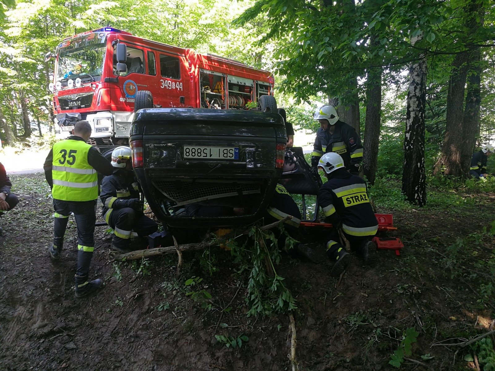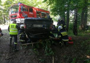 Kierujący samochodem osobowym utracił panowanie nad pojazdem, w wyniku czego dachował. Zadanie polegało na wydobyciu poszkodowanego.