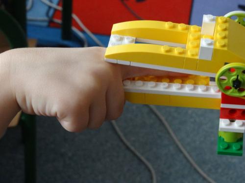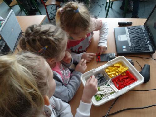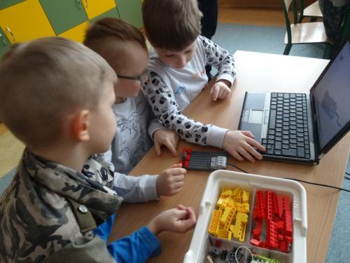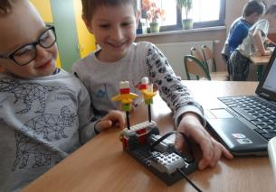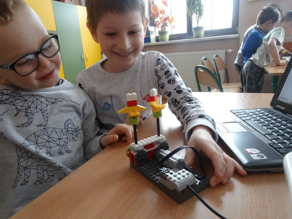 Zadaniem dzieci było złożenie klocków wg instrukcji na monitorze. Następnie przy podłączeniu przewodów do komputera i naciśnięciu odpowiednich klawiszy i wprowadzały w ruch zbudowane wcześniej budowle. Większość dzieci bardzo szybko poradziła sobie z kolejnymi etapami zadań. Widać było, że ten rodzaj zabawy sprawia im ogromną radość, a klocki Lego i komputer nie stanowi żadnej trudności.