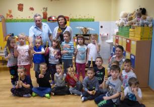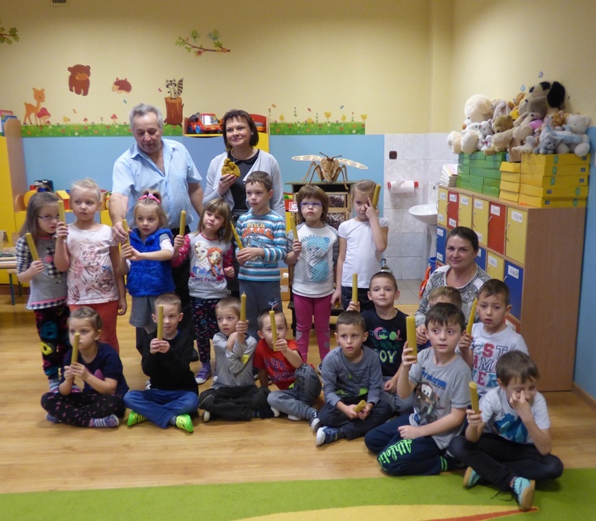 W piątkowe przedpołudnie 25 listopada 2016 roku nasze przedszkole zapachniało pszczelim woskiem. Stało się to za sprawą naszego gościa p. Henryka Widlarza - mistrza pszczelarstwa, który chętnie i bezinteresownie odpowiedział na nasze zaproszenie. Celem spotkania były warsztaty artystyczne wykonania świec z plastrów wosku. Na wstępie pan Henryk przybliżył dzieciom zagadnienia związane z życiem pszczół oraz proces powstawania miodu. Dzieci miały okazję zaobserwować etapy wykonania figurek świecowych przyglądając się przygotowaniu formy silikonowej, założeniu knota i uzupełnieniu jej roztopionym ciepłym woskiem. Punktem kulminacyjnym warsztatów było samodzielne wykonanie świecy z plastra wosku. Dzięki temu dzieci miały okazję poznać strukturę materiału, jego zapach a w efekcie precyzyjnie uformować kształt świecy. Zajęcia zakończyły się degustacją słodkiego miodu podarowanego przez naszego gościa. Każdy przedszkolak zabrał ze sobą do domu swoją niepowtarzalną świecę. Panu Henrykowi serdecznie dziękujemy i wierzymy, że przekazana dzieciom wiedza i doświadczenie okażą się przydatne w życiu.