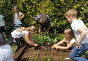 Końcem maja odbyły się również trzykrotnie przekładane ze względu na pogodę bardzo ciekawe warsztaty ogrodnicze prowadzone przez ogrodnika P. Antoniego Mleczko. W piękny słoneczny dzień, który „trafił się” między ulewnymi deszczami P. Antoni pomógł założyć uczniom warzywnik na przygotowanym przez organizatora programu podwyższonym zagonie ,który znalazł miejsce w zacisznym kącie przyszkolnego Ogrodu Edukacyjno-Rekreacyjnego. Dzięki dostarczonej przez ogrodnika odpowiedniej ziemi oraz nasionom i rozsadzie warzyw dzieci nauczyły się siać i sadzić, a dzięki tej akcji szkoła ma swój ogródek.