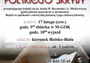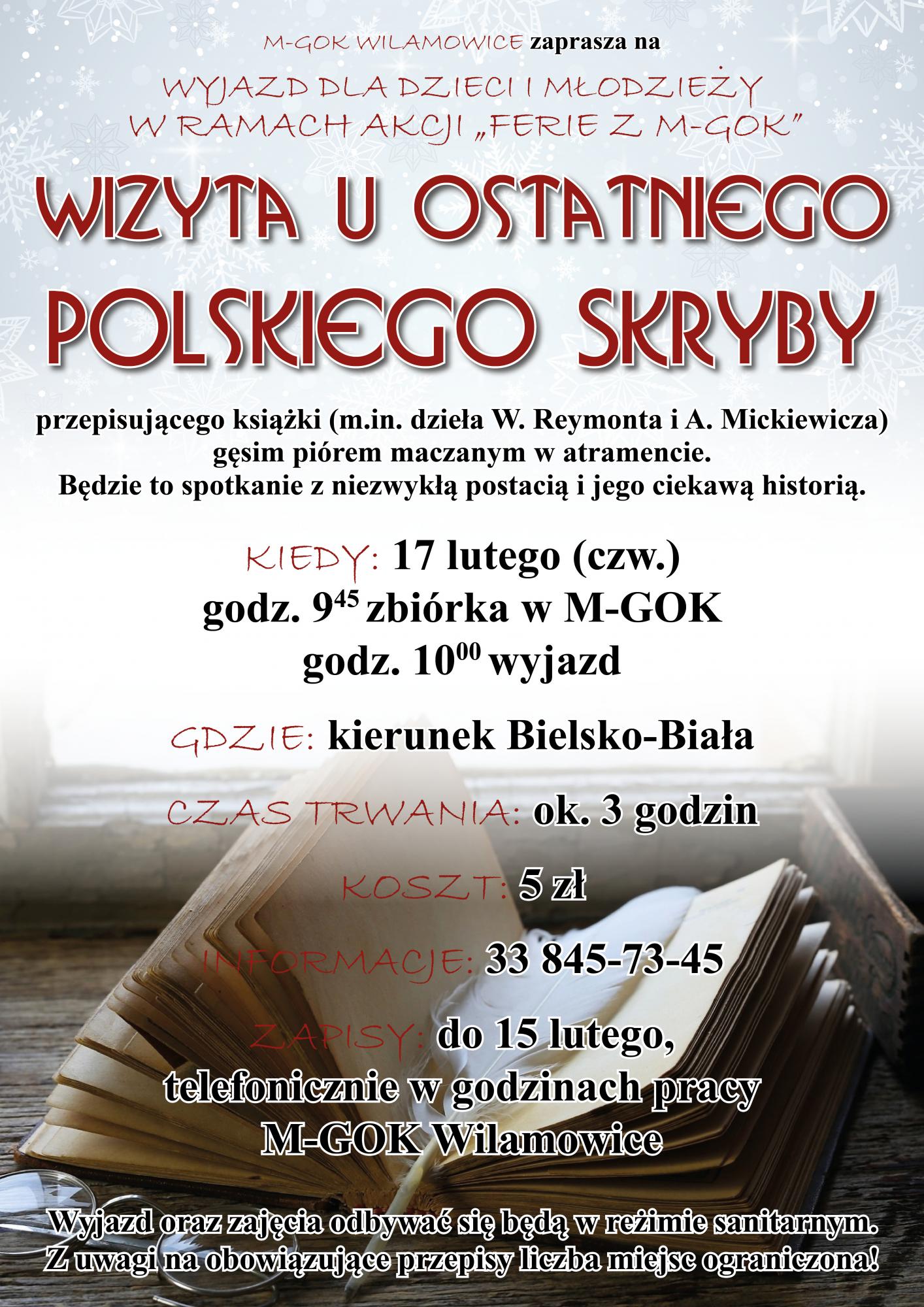 Wizyta u ostatniego polskiego skryby - wyjazd w ramach akcji "Ferie z M-GOK" pt., 2022-02-04 11:03 | Anna Klimczak BRAK WOLNYCH MIEJSC! Otwarta lista rezerwowa, decyduje kolejność zgłoszeń. Prosimy o wypełnienie i podpisanie zgody na wyjazd (do pobrania poniżej) oraz zabranie jej przez dziecko w dniu zajęć. Pliki: Zgoda na wyjazd.pdf