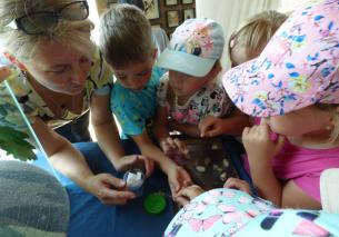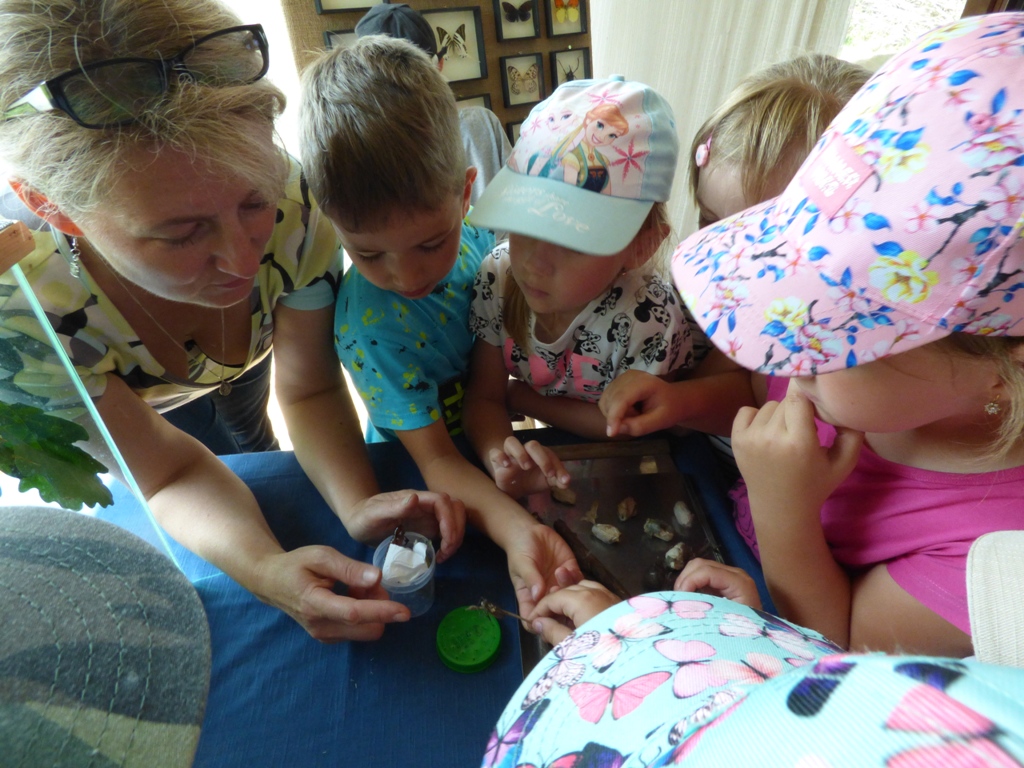 Kolejnym punktem wycieczki była pogadanka podczas której dzieci poznały ciekawostki ze świata motyli i chrząszczy. Obejrzeliśmy prawdziwe i spreparowane okazy w gablotach. Mogliśmy poczuć na dłoni straszyka australijskiego (patyczaka), a także liściec. Zapamiętaniu wiedzy sprzyjała możliwość bezpośredniej obserwacji oraz możliwość zadawania pytań gospodarzom. Zainteresowanie wzbudziła ciekawa roślina owadożerna- rosiczka, która poluje na będące w sąsiedztwie owady.