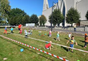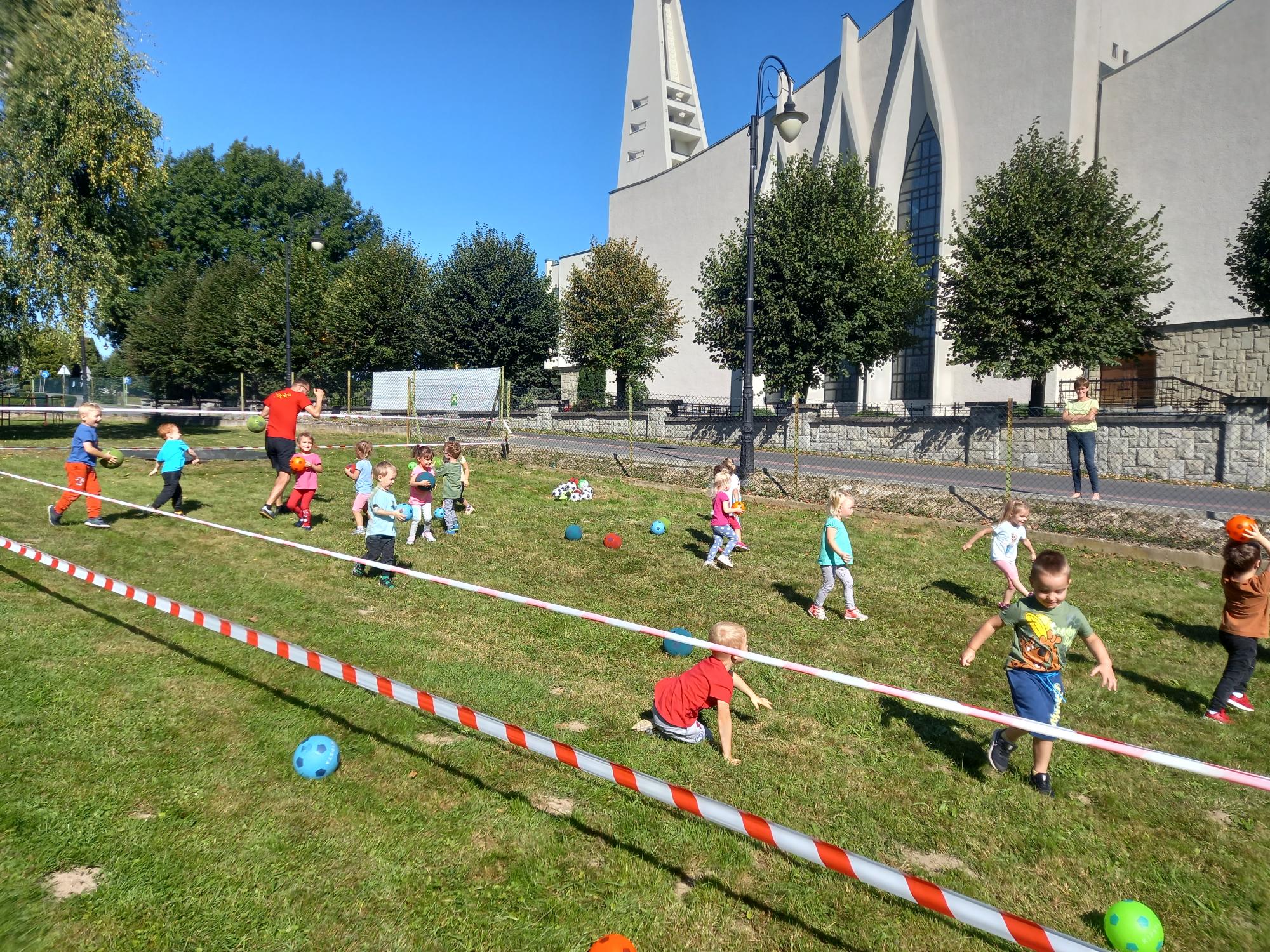 W piątek 10 września wszystkie dzieci oraz wychowawczynie przyszły do przedszkola w strojach sportowych przygotowani na garść wrażeń i dobrą zabawę. W ogródku przedszkolnym odbyły się gry i zabawy ruchowe prowadzone przez trenerów klubu „Sportowe Przedszkolaki”. Głównym celem zajęć było zachęcanie dzieci do aktywności ruchowej na świeżym powietrzu, kształtowanie zachowań prozdrowotnych oraz nabywanie wiary we własne siły i możliwości. Wszystkie przedszkolaki były pod wielkim wrażeniem prowadzonych gier i zabaw, a na każdej buzi gościł uśmiech i zadowolenie z siebie. Po skończonej zabawie wszystkie dzieci otrzymały medale oraz naklejki i pełne pozytywnej energii pomaszerowały na smaczny obiad.
