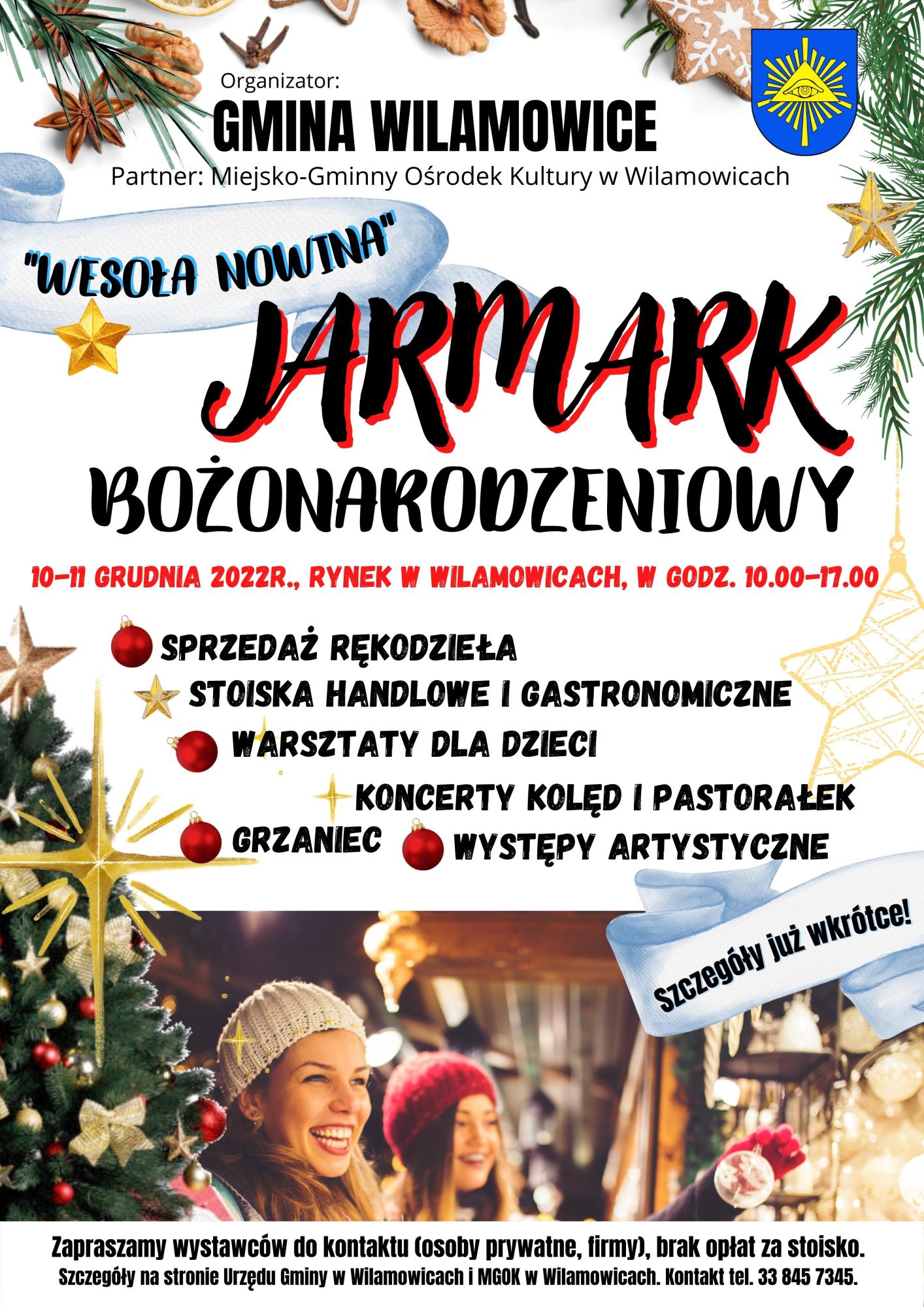 Ruszyły przygotowania do organizacji pierwszego Jarmarku Bożonarodzeniowego "Wesoła Nowina" w Wilamowicach. Zapraszamy do współpracy wystawców zainteresowanych sprzedażą swoich produktów na rynku w Wilamowicach oraz mieszkańców całej gminy do udziału w wydarzeniu. Poczujmy magię Świąt!