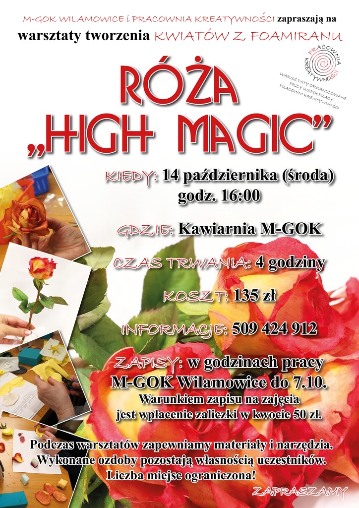 Zapraszamy na warsztaty!!! Róża "High magic" pt., 2020-09-18 14:13 | Anna Klimczak Podczas warsztatu każdy uczestnik wykona różę „High magic” z zimnego foairanu. Taki kwiat, bardzo realistyczny, będzie wyjątkową ozdobą domu lub prezentem dla kogoś bliskiego.