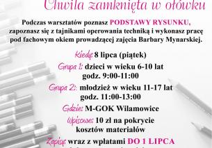 Zapraszamy na warsztaty rysunku pod kierunkiem artystki Barbary Mynarskiej - zajęcia 8 lipca pon., 2022-06-27 11:23 | Anna Klimczak